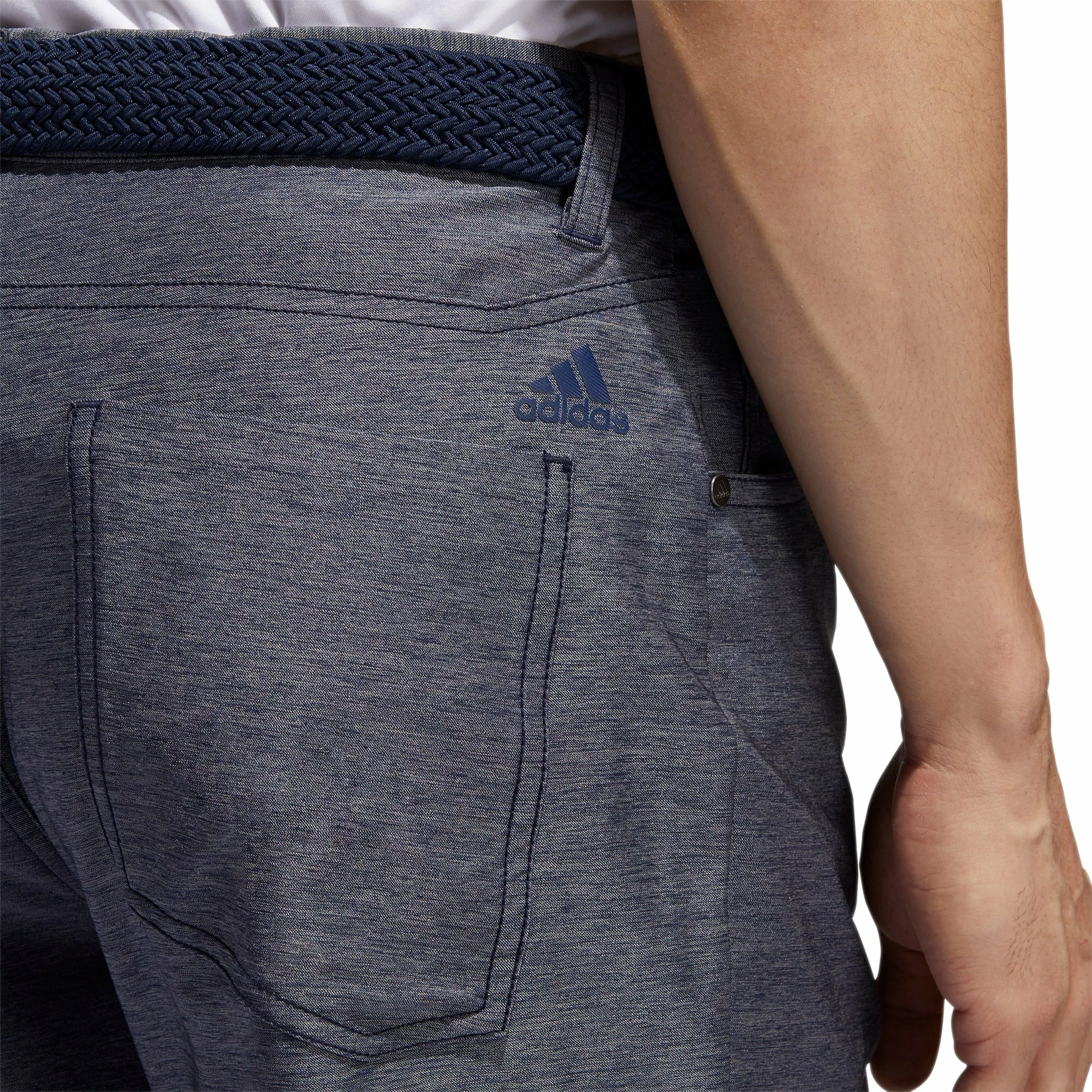 Walk the course in comfort and style with the Adidas Ultimate365 Heather Five-Pocket Golf Shorts. These shorts are built with dependable comfort and flexible mobility with moisture absorbing stretch fabric with a water-resistant finish that will keep you dry and comfortable during your entire round. There is a silicone gripper tape on the inside waistband to keep your shirt tucked in during all swings and a UV 50+ sun rating keeps you protected from the harmful UV rays of the sun.