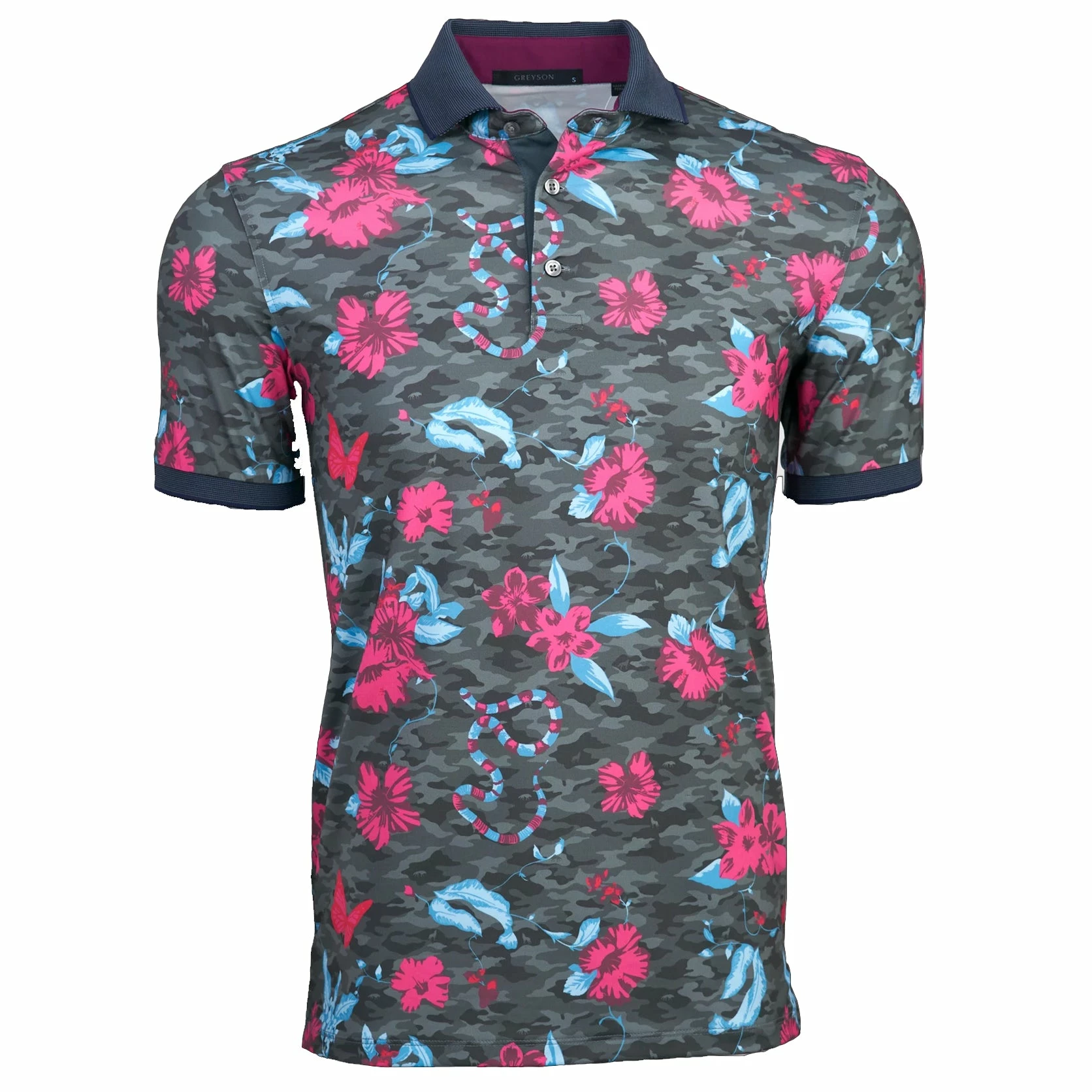 Take your style game to the next level with the Greyson American Beauty Golf Polo. This polo is built with an eight-way stretch that provides total round comfort and its also moisture wicking and quick drying for added comfort. A UVA and UVB sun protectant keeps you protected from the harmful UV rays of the sun. The American Beauty features an all-over print that is super unique with a reimagined concept of camo that will have you looking good on and off the golf course.