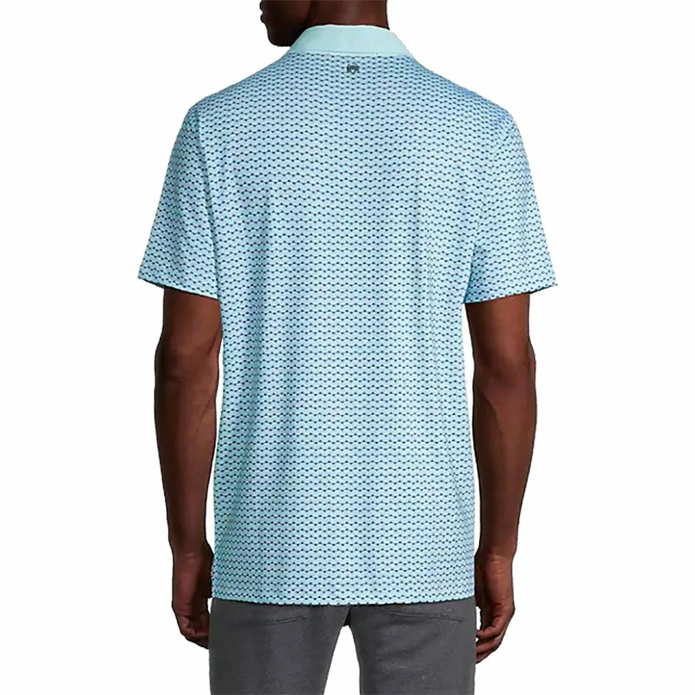 Show up to your next round of golf in style with the Greyson Jaws Mens Golf Polo. This polo features a four-button placket, a contrast spread collar, and an all-over geometric shark fin print for an added touch of style. Four way stretch fabric allows you to swing with ease while its moisture-wicking properties keep you cool and dry.
