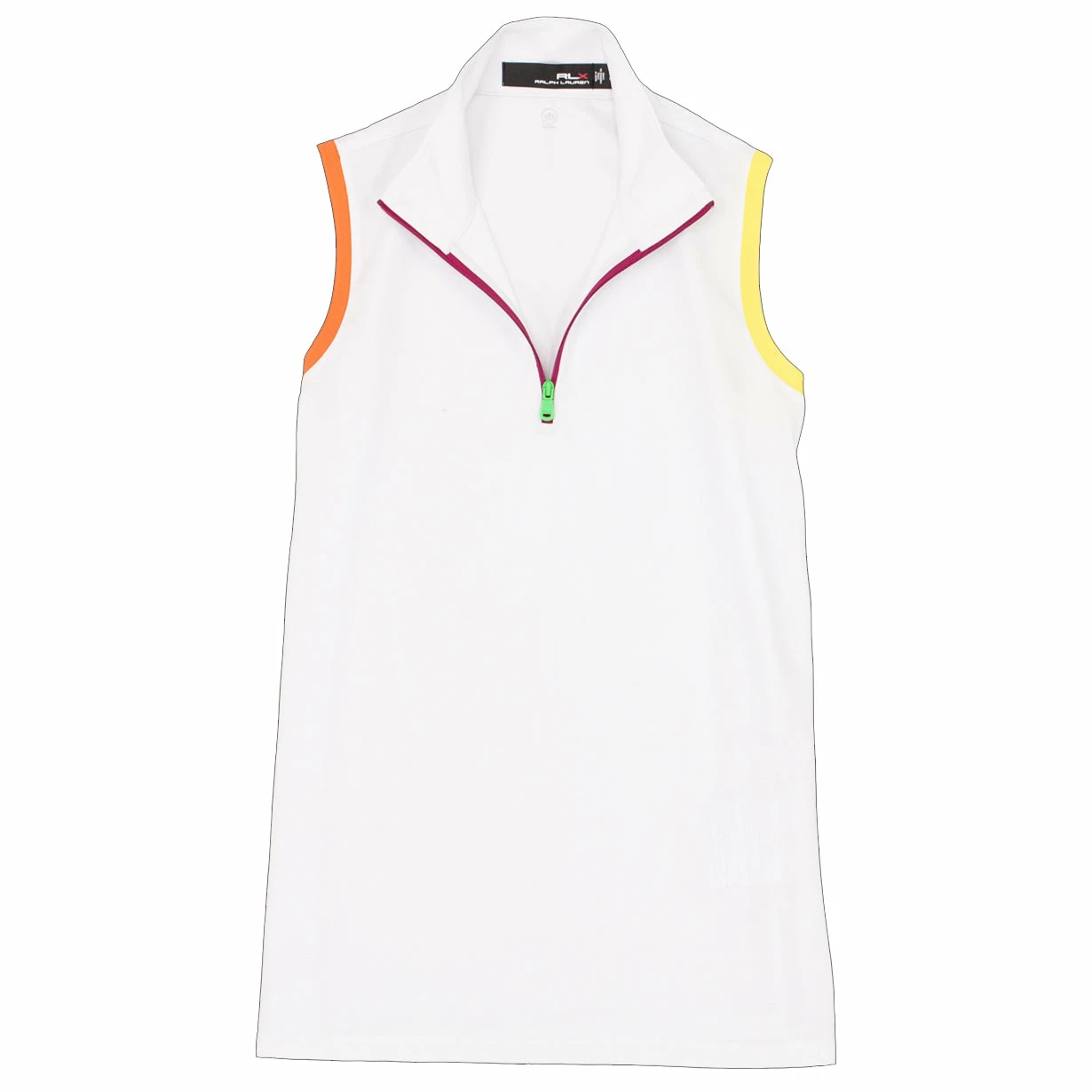 Perfect for sunny days on the course comes the RLX Tri-Colored Airtech Pique Golf 1/4 Zip. This sleeveless polo is built with an Airtech pique that is moisture wicking to pull sweat from the body and keep you dry and comfortable throughout the round. The 1/4 zip placket allows you to control the coverage and the pops of color at armholes and center front zipper with a printed silver RLX at right hem and center back neck add a touch of style to keep you looking good on and off the golf course.